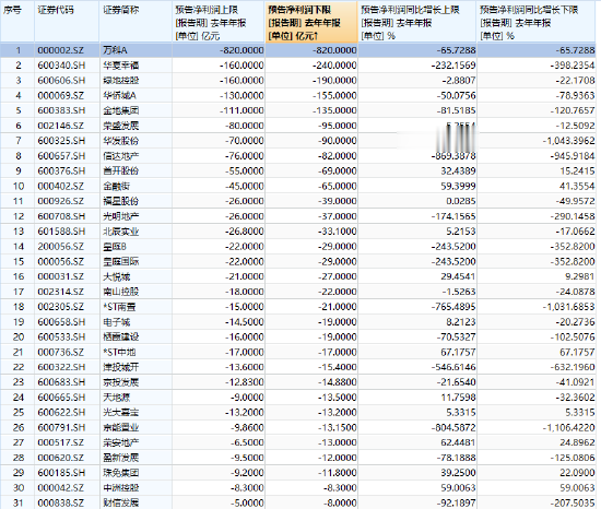 在已披露预告的房企中,预计亏损超过百亿的有5家。万科A目前位列亏损规模首位,预计2025年归属于上市公司股东的净利润亏损约820亿元,同比亏损扩大约65.7%;扣非净利润亏损约800亿元,同样较上年显著扩大。